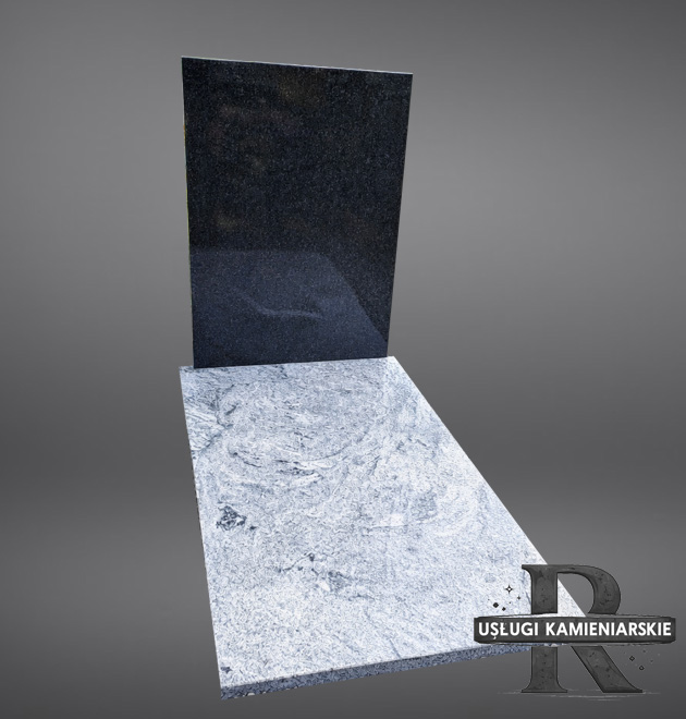 Prezentowany nagrobek to wyjątkowe połączenie dwóch szlachetnych materiałów, które tworzą harmonijną i nowoczesną kompozycję. Projekt opiera się na minimalizmie i grze kontrastów – głębi ciemnego granitu Impala oraz lekkości jasnego Wiscount White o unikalnym użyleniu.
