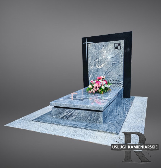 Ekskluzywny nagrobek wykonany z indyjskiego granitu Viscount White, charakteryzującego się unikalnym, dynamicznym użyleniem w odcieniach bieli i szarości. Nowoczesny charakter projektu podkreśla czarny ekran z polerowanego granitu, który tworzy wyrazisty kontrast i zapewnia doskonałą czytelność liter. Całość osadzona jest na efektownej podcince, która nadaje bryle lekkości, sprawiając wrażenie, jakby płyta główna unosiła się nad ramą. To połączenie surowej elegancji z najwyższą trwałością, idealne dla osób szukających minimalistycznego, a zarazem prestiżowego designu.